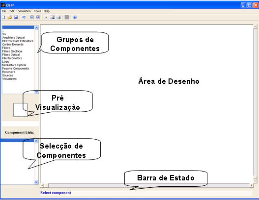 Nesta interface observamos cinco zonas bem distintas: a zona de selecção do grupo de componentes, a zona de selecção do componente,